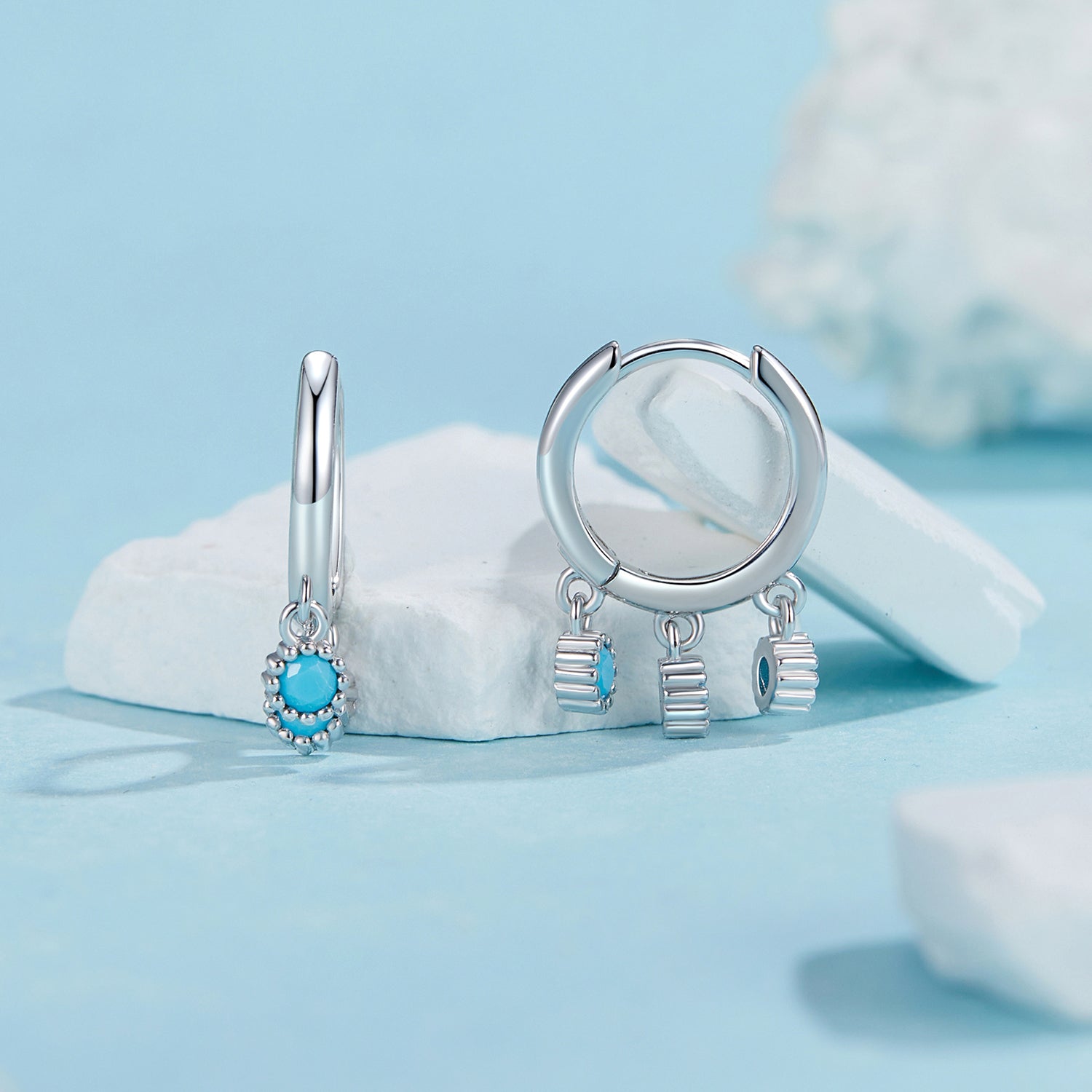 Tre piccole pietre turchesi pendenti donano movimento e freschezza a questi orecchini a cerchio dal design pulito. Il contrasto tra il blu vivace e la finitura lucida crea un effetto elegante ma giocoso. Perfetti per chi ama i dettagli che sanno di mare e libertà. Un tocco estivo da indossare tutto l’anno.